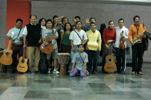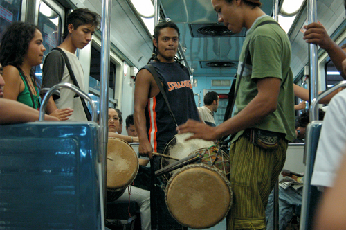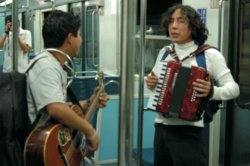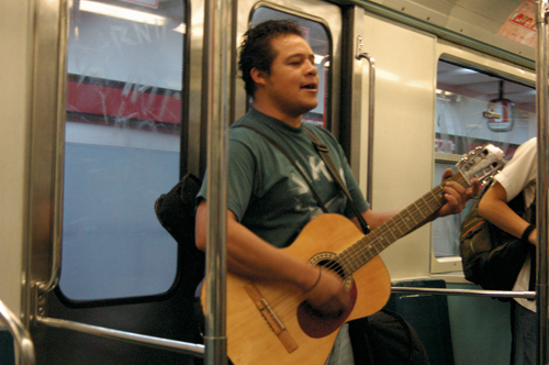 *********************************/ Hay habitantes del sistema de transporte que se desplazan con gran habilidad entre sus fisuras. Pocas veces los encontramos de nuevo, pero siempre es ineludible toparse con alguno. Los músicos, en especial, son corresponsales insustituibles de una memoria involuntaria que trae reminiscencias de un orden arcaico. Rara vez, sin embargo, se reconocen las posibilidades renovadoras de estos herederos de juglares, trovadores, y sobre todo de los míticos vagantes, quienes durante la Edad Media europea parecían aspirar a un reordenamiento del mundo con su falta de respeto hacia todo lo que por convencionalismo merecía reverencia. En esta ocasión queremos transmutar un convoy del metro en lugar público de conciertos donde la atención se desplace por entero hacia estos actores del espacio colectivo, al menos hacia una selección del gremio. Que los usuarios fluyan entre los vagones, que inviertan en el recorrido la disposición usual y sean ellos los que se deslicen entre las hendiduras del sistema. Es posible que su acción se vuelva revolucionaria no porque logre traducir o explicar para sí mismos la vida, sino porque pueda intensificar la magnitud de su experiencia. La creación de un nuevo sentido no consiste en la reorganización novedosa de objetos ni de formas, sino en la invención de nuevas leyes capaces de reinventar la disposición usual sobre ese mismo orden.
