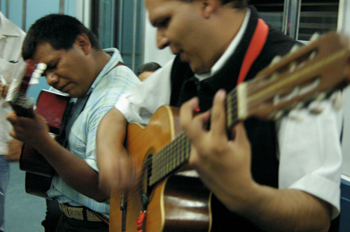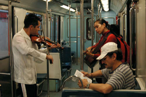 *********************************/ Hay habitantes del sistema de transporte que se desplazan con gran habilidad entre sus fisuras. Pocas veces los encontramos de nuevo, pero siempre es ineludible toparse con alguno. Los músicos, en especial, son corresponsales insustituibles de una memoria involuntaria que trae reminiscencias de un orden arcaico. Rara vez, sin embargo, se reconocen las posibilidades renovadoras de estos herederos de juglares, trovadores, y sobre todo de los míticos vagantes, quienes durante la Edad Media europea parecían aspirar a un reordenamiento del mundo con su falta de respeto hacia todo lo que por convencionalismo merecía reverencia. En esta ocasión queremos transmutar un convoy del metro en lugar público de conciertos donde la atención se desplace por entero hacia estos actores del espacio colectivo, al menos hacia una selección del gremio. Que los usuarios fluyan entre los vagones, que inviertan en el recorrido la disposición usual y sean ellos los que se deslicen entre las hendiduras del sistema. Es posible que su acción se vuelva revolucionaria no porque logre traducir o explicar para sí mismos la vida, sino porque pueda intensificar la magnitud de su experiencia. La creación de un nuevo sentido no consiste en la reorganización novedosa de objetos ni de formas, sino en la invención de nuevas leyes capaces de reinventar la disposición usual sobre ese mismo orden.